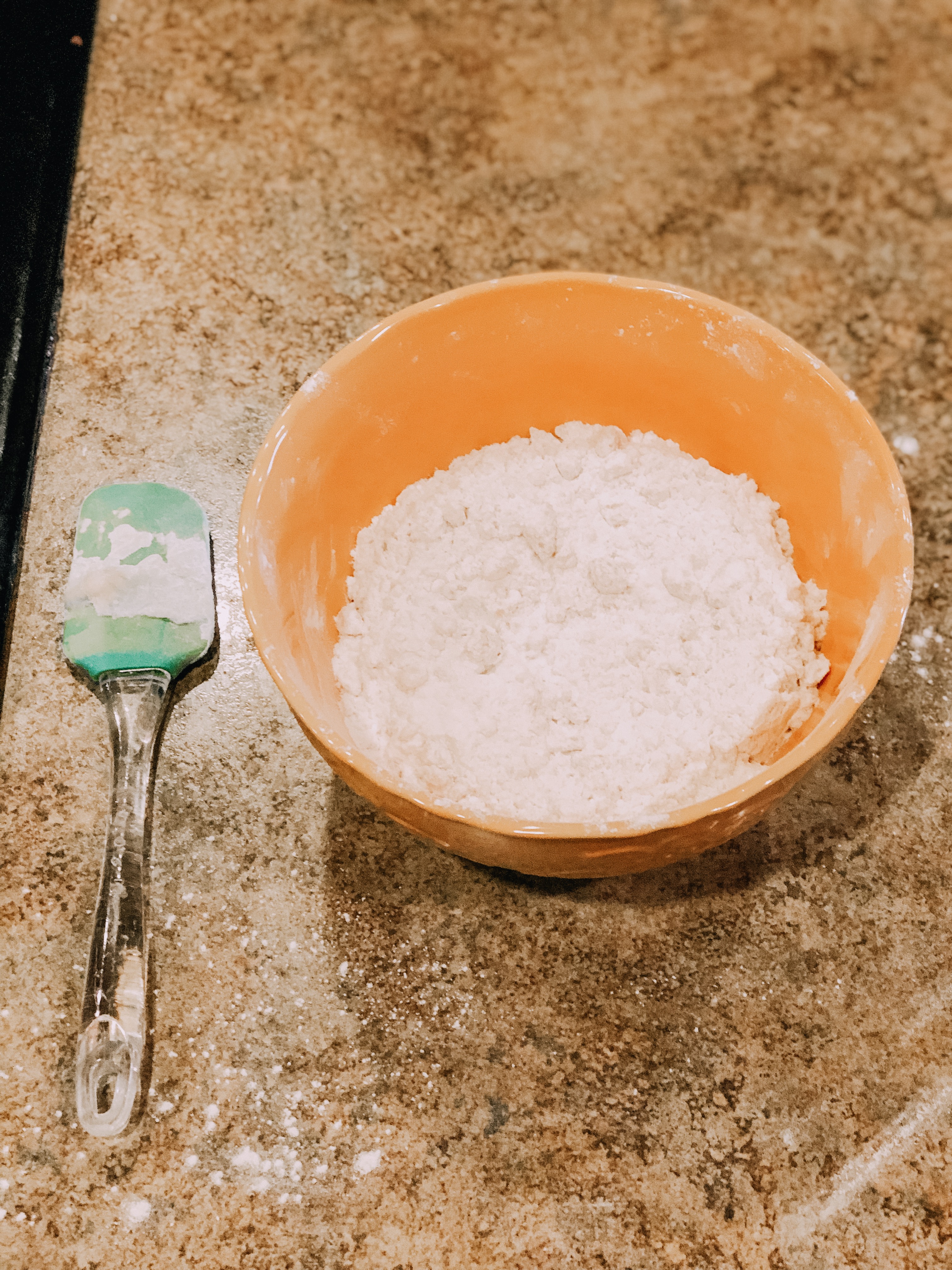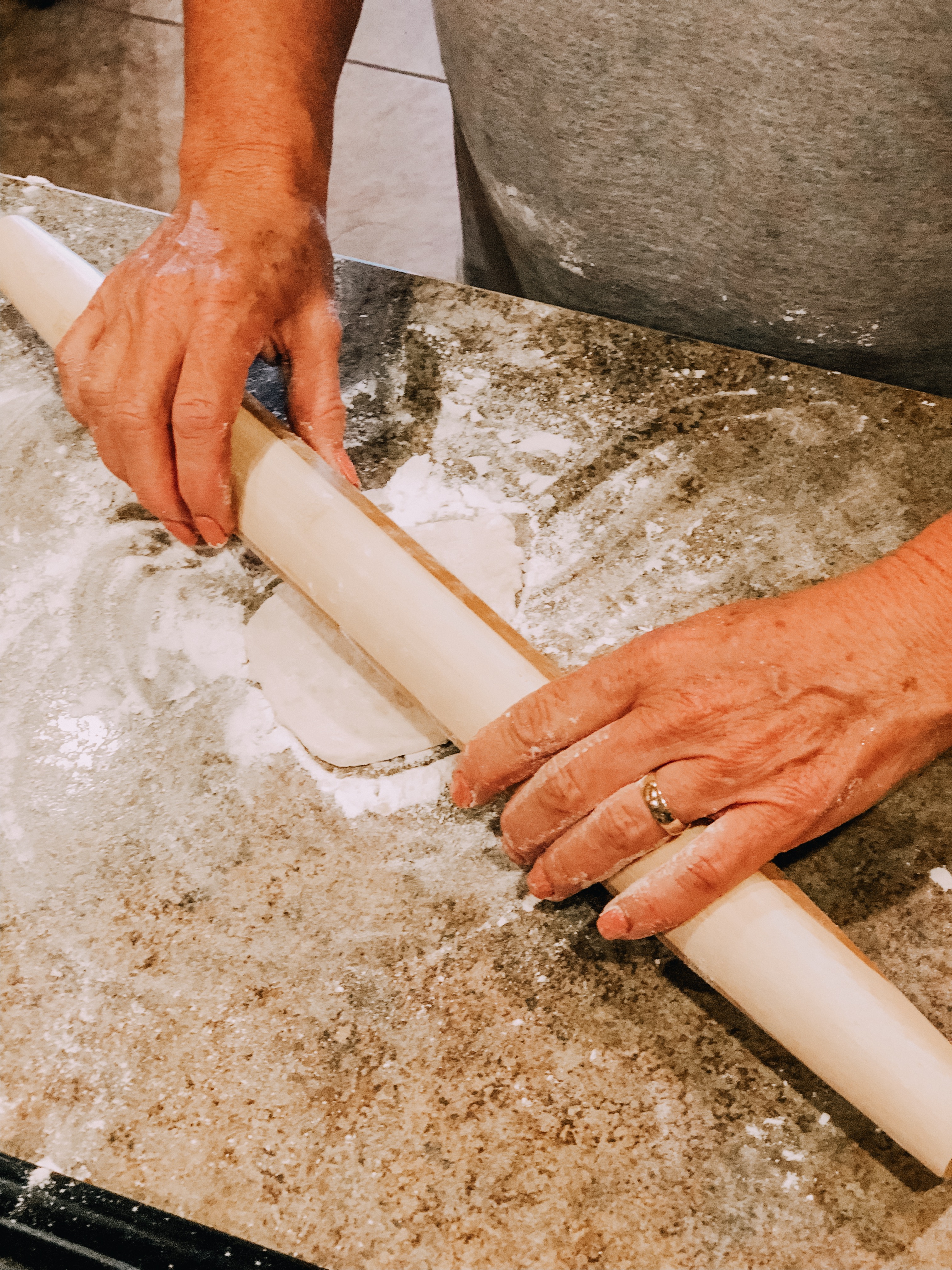 1. Prep your work area. I was sure to clean my counter, lay down parchment paper with tape, and gathered my rolling pin. I also go ahead and put my flat skillet on the stove and turn it on medium heat.