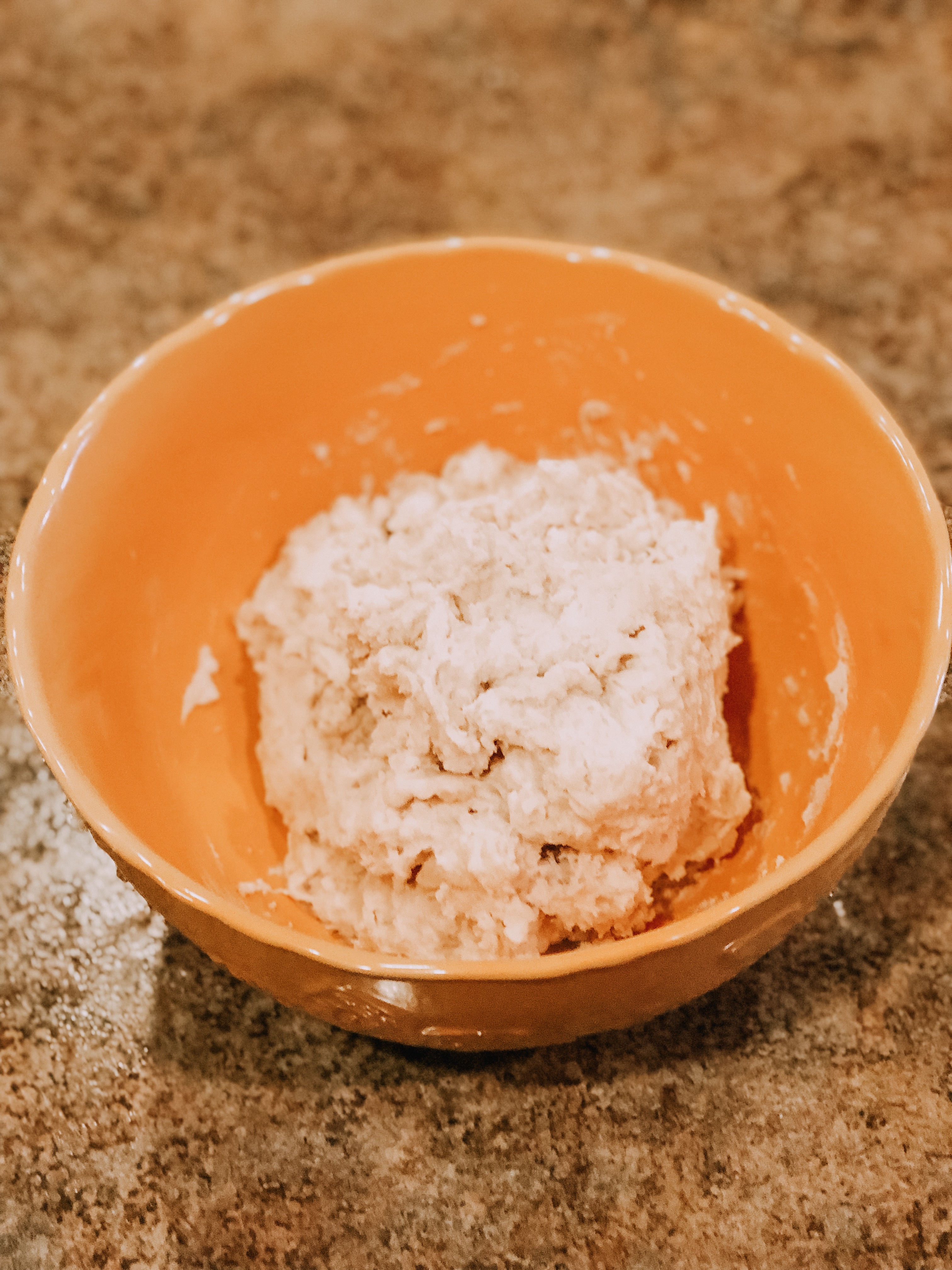 4. Add the warm water and mix until a dough consistency forms. You will notice the mixture start to pull away from the sides of the bowl. Cover and let rise for just a little bit.