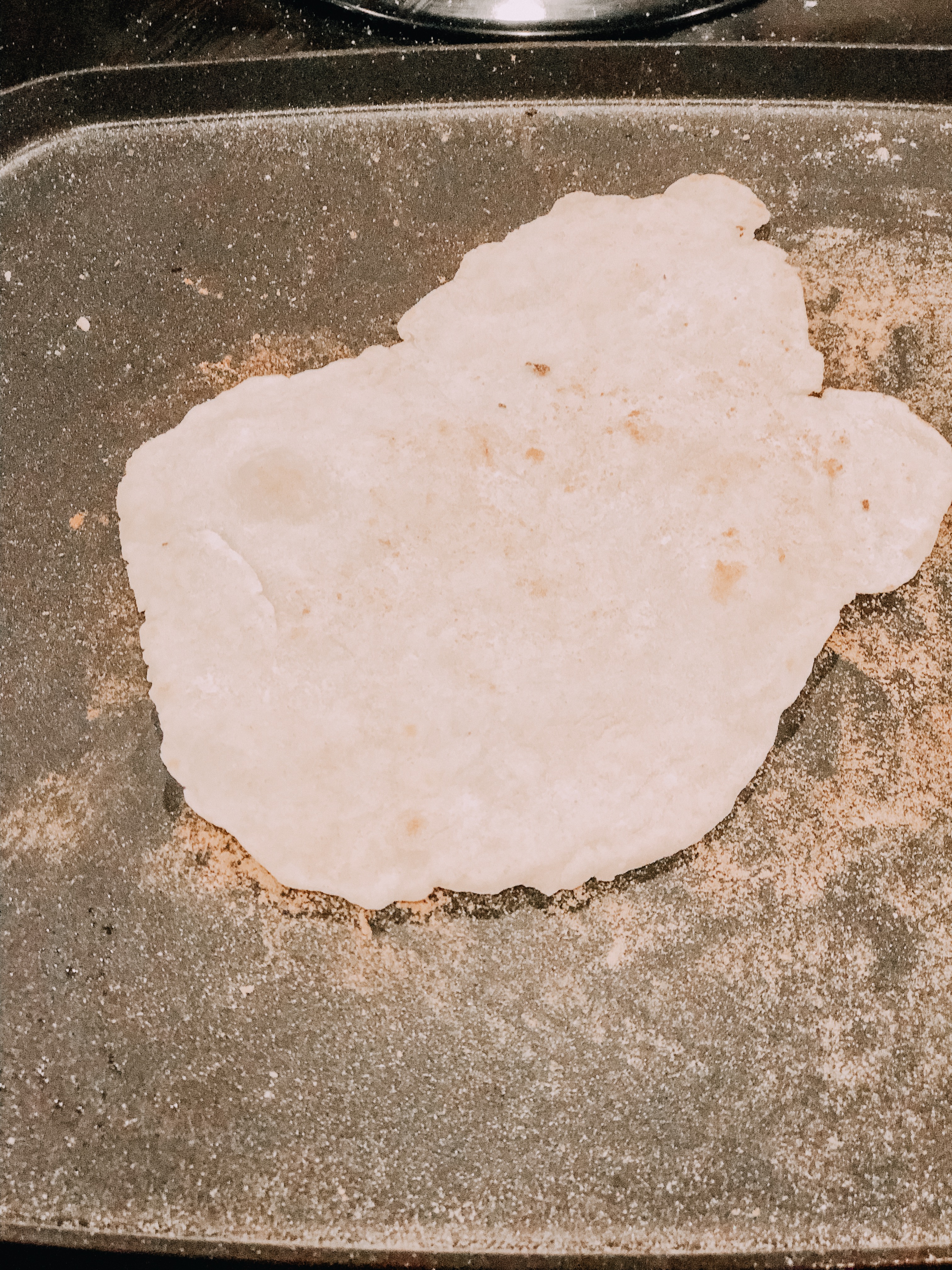 6. When you have achieve your desired thickness and size, place your tortilla on the skillet for roughly 25 seconds. You will see it start to brown and potentially bubble. When this happens, it is time to flip! Once both sides are lightly browned, you are done!