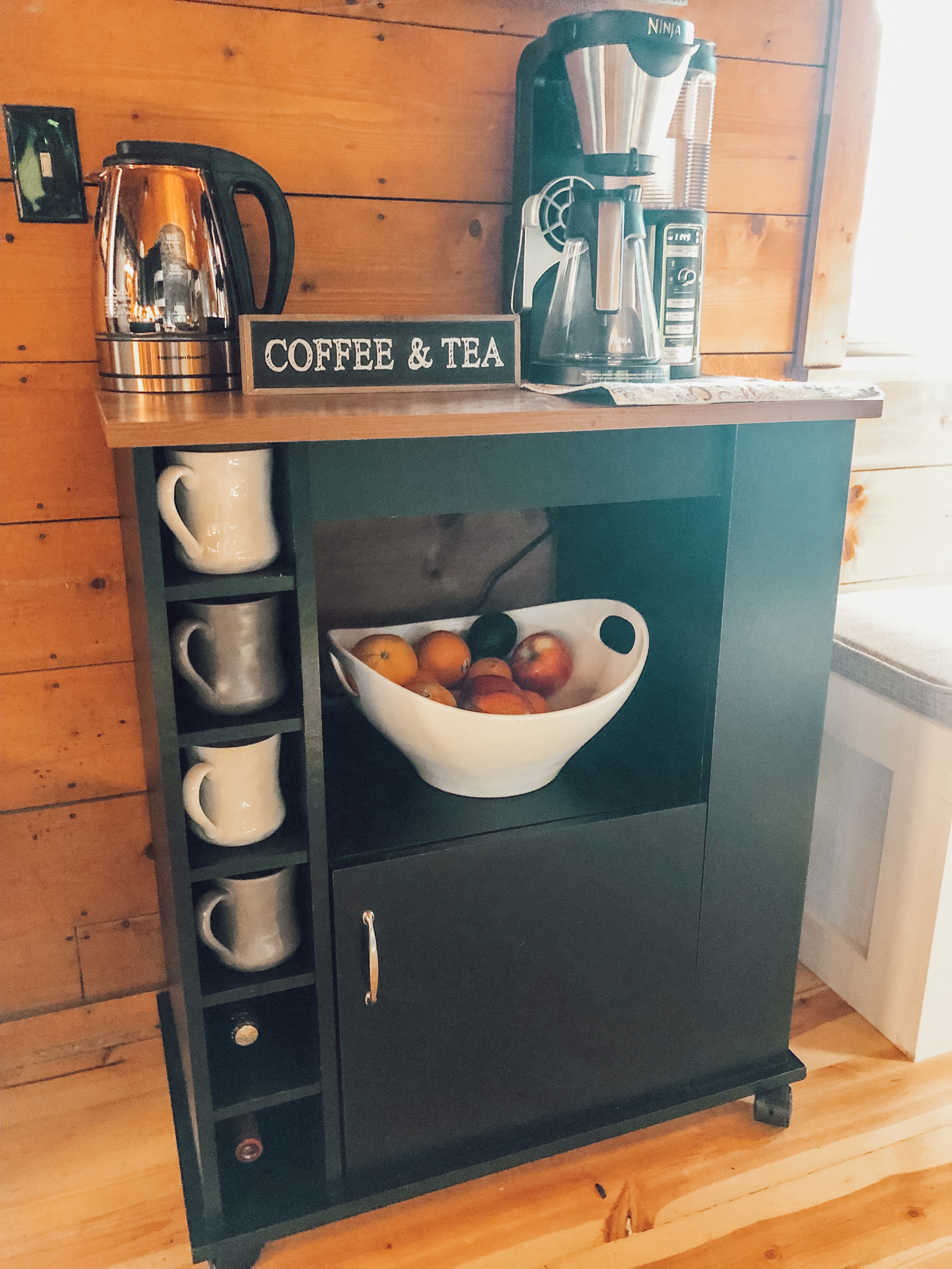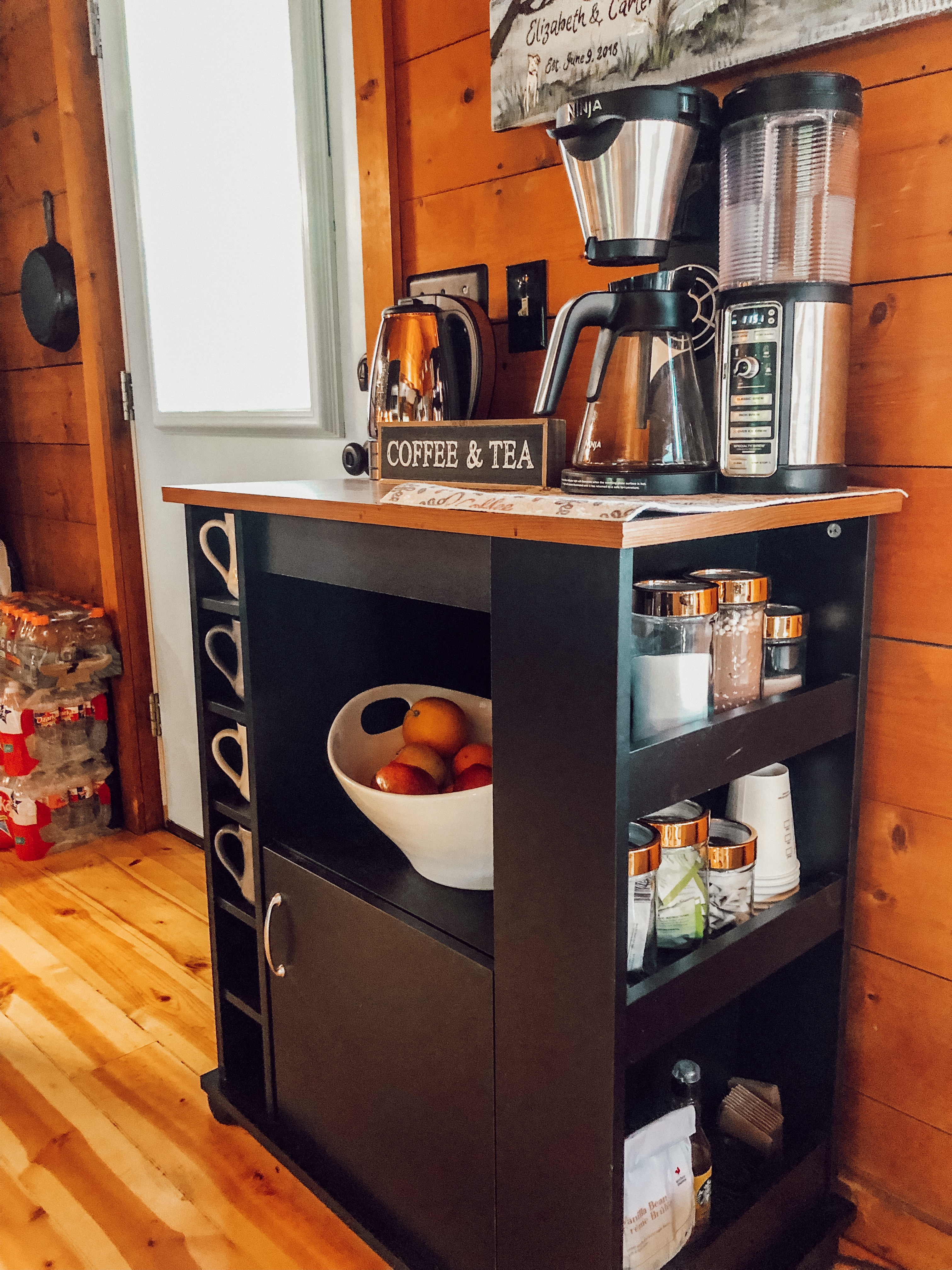 But wait! There is more! Which is part of why I really love this addition to our home. Along the right side, there are these super convenient shelves where I store jars of creamer, hot cocoa, teas, to-go cups, syrup, and coffee grounds. Everything I need to make a specialty coffee in the morning is all stored in this little space!