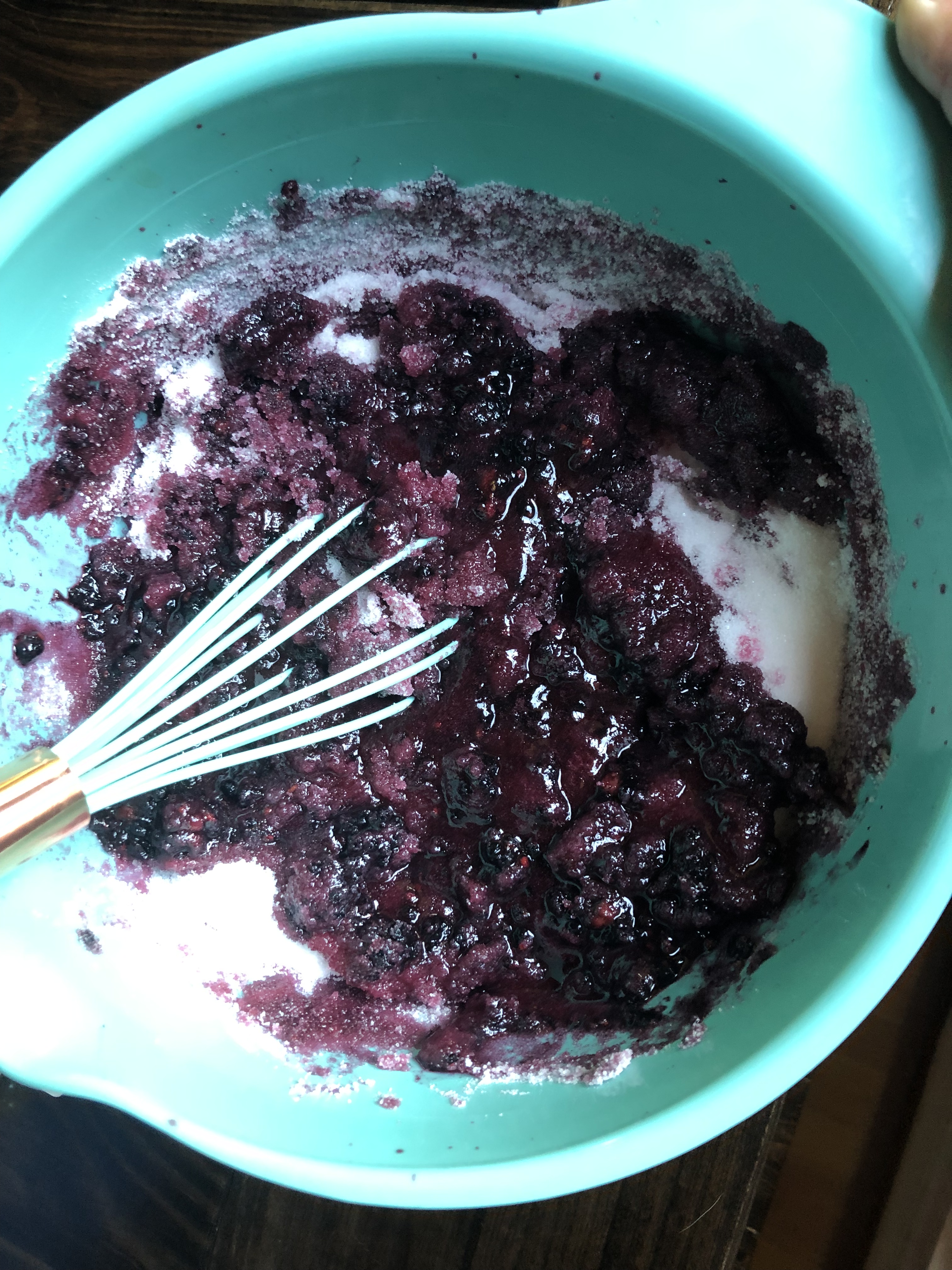 - Mix together crushed fruit and sugar and let sit for 10 mins.
