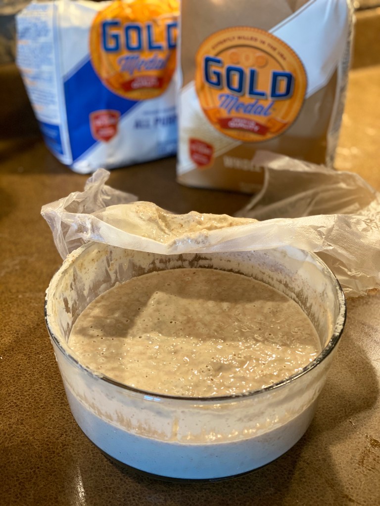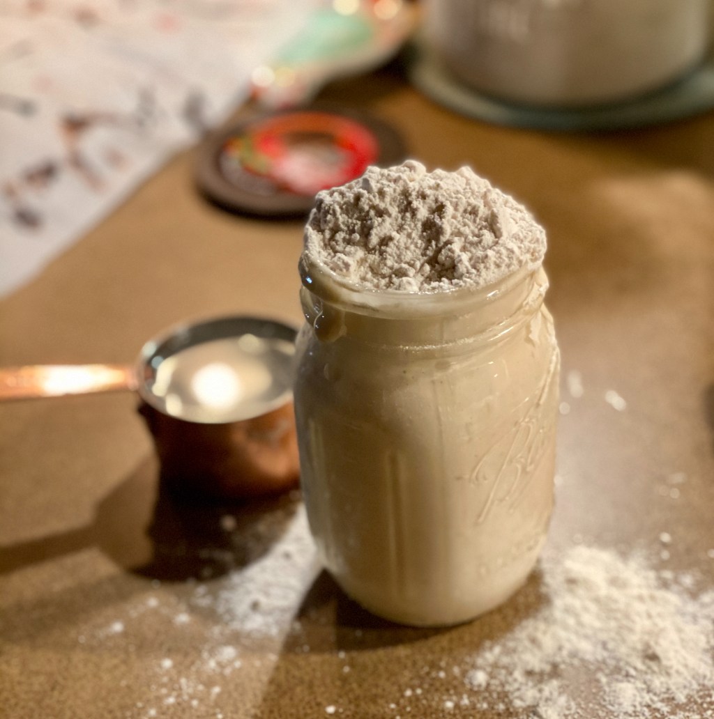 2. Figure out what the heck I was doing. In short, I measure out 1 cup ( a scant to be exact) of unbleached all-purpose flour and 1/2 c room temperature water. I stirred the ingredients together, popped the lid on, and went to bed. Literally.