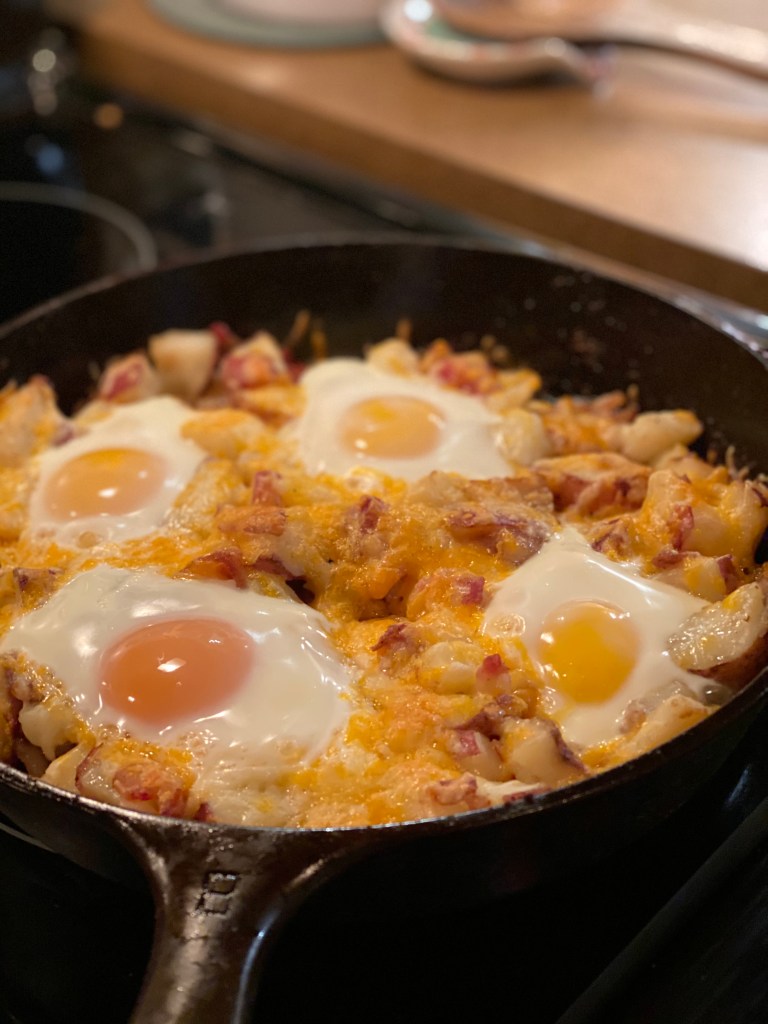 A “cowboy skillet” (i need to layoff the Yellowstone) packed with potatoes, bacon, onions, cheese, and perfectly cooked farm fresh eggs. It’s a splurge on the caloric intake but wow–so hearty.