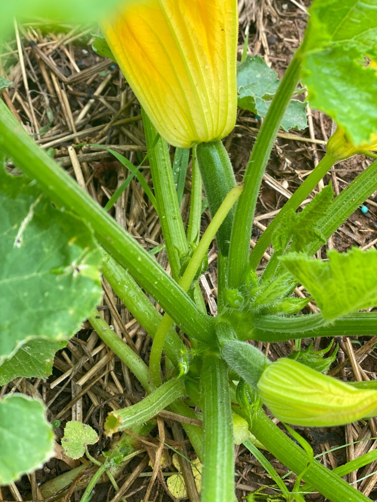 You can see where I pruned back some leaves and some very healthy looking zucchini blooms!